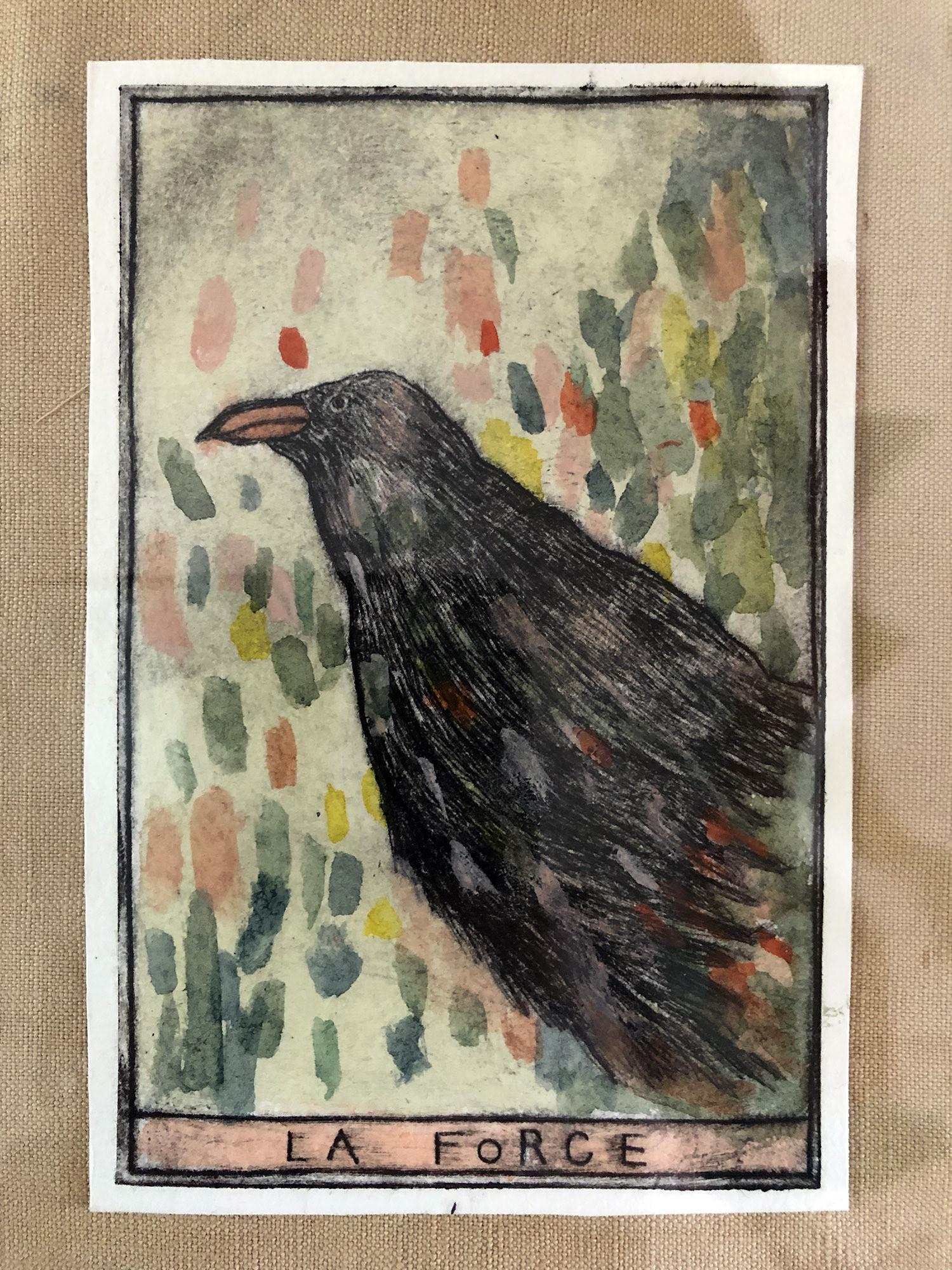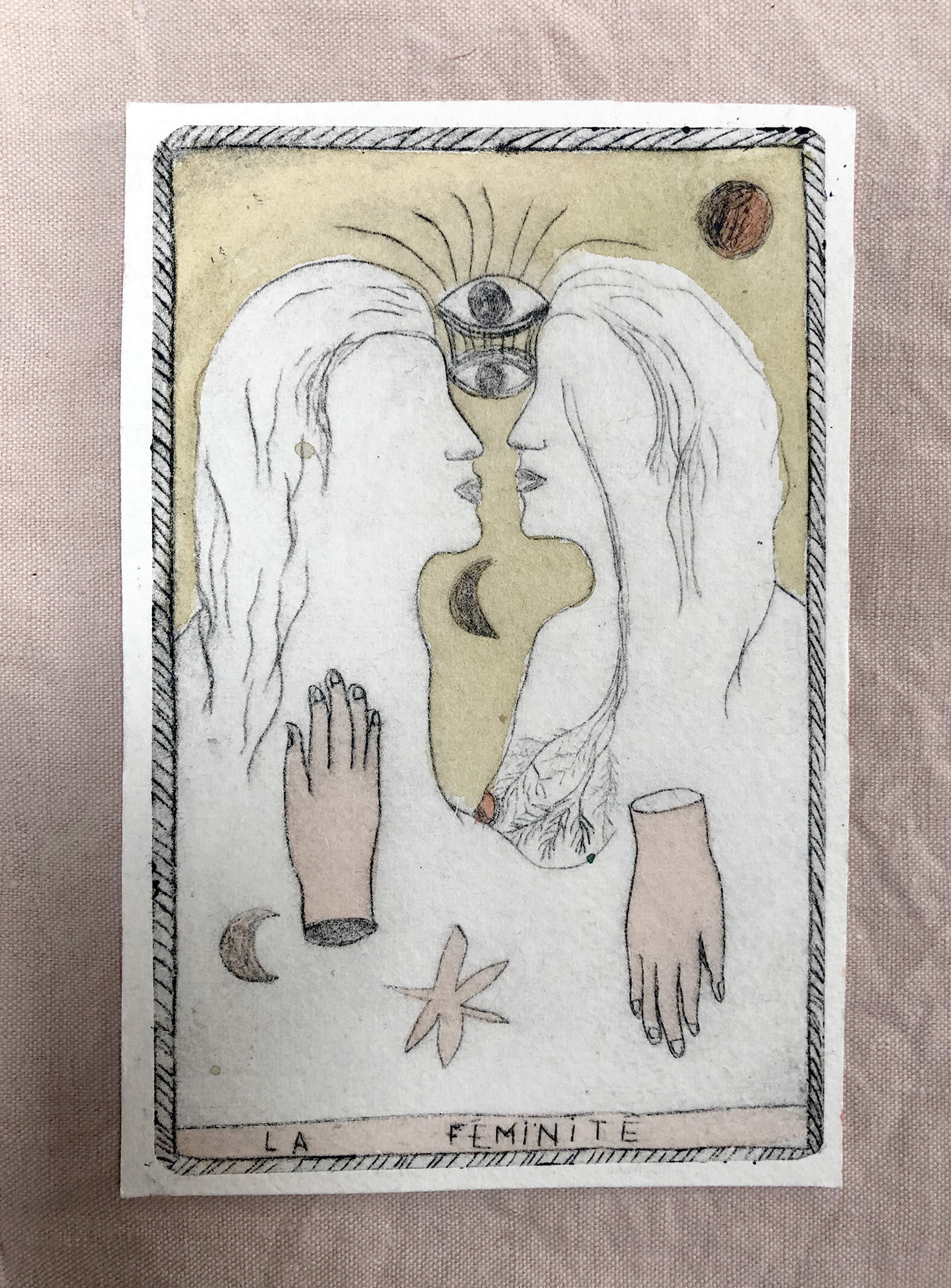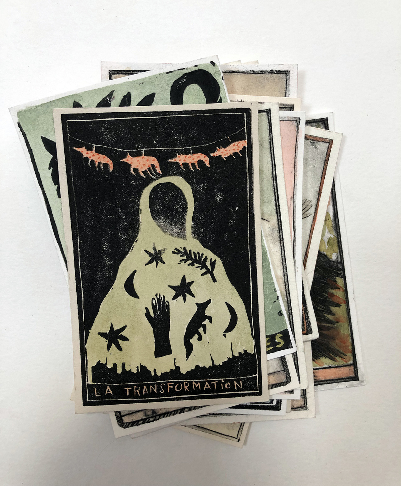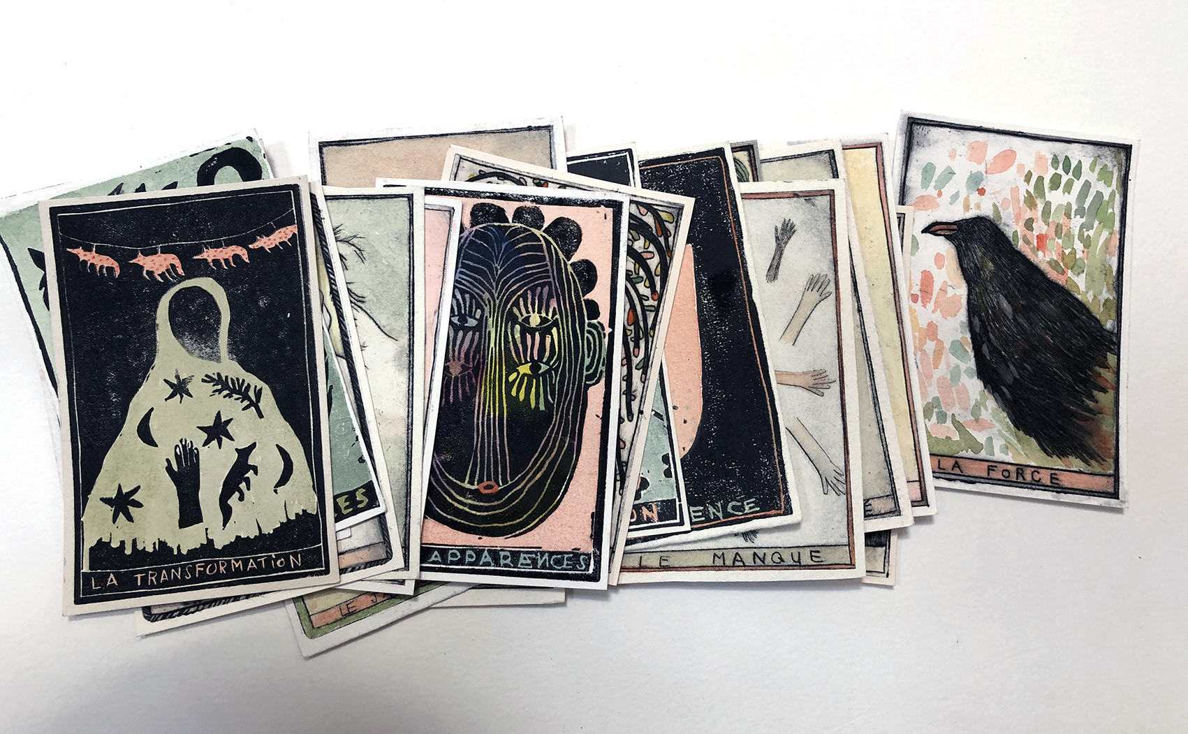J'ai crée cet oracle intuitif en gravures sur rhénalon et en linogravure réhaussées à l’aquarelle. Les oracles m'accompagnent et me guident régulièrement. J'aime leurs valeurs symboliques, mystérieuses et j'aime par dessus tout l'idée qu'ils génèrent, c'est à dire que nous n'avons pas la maîtrise sur tout, et peut être même sur rien du tout! J'aime l'appeler "le grand jeu de la vie".