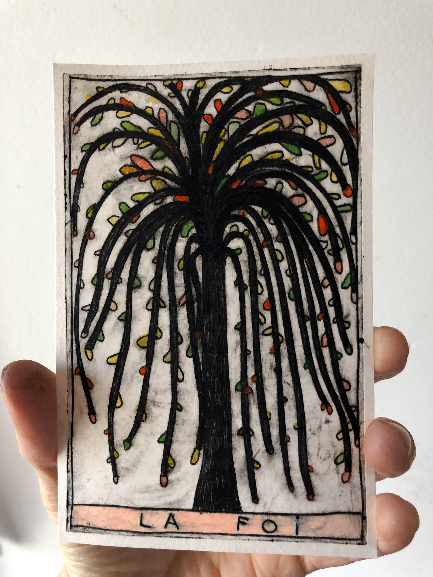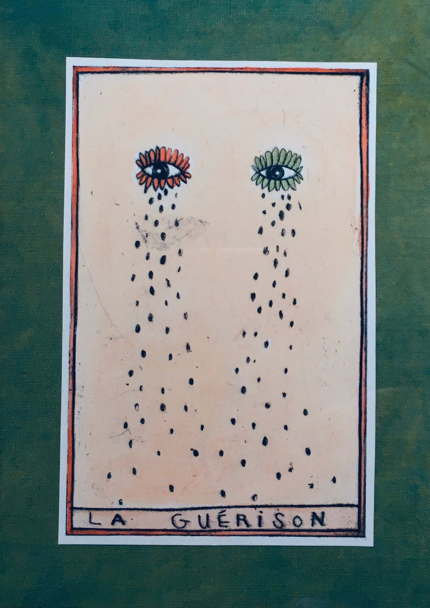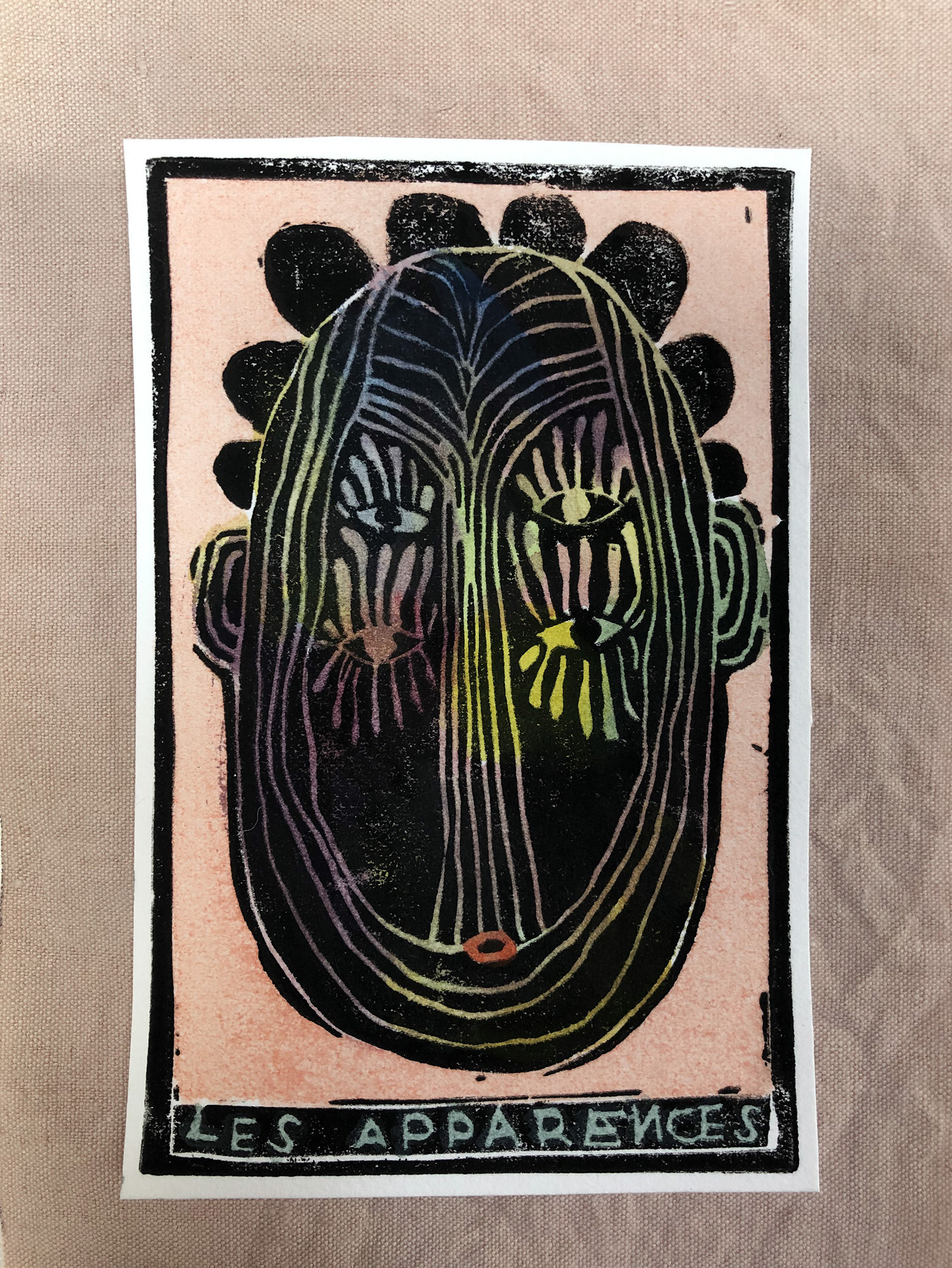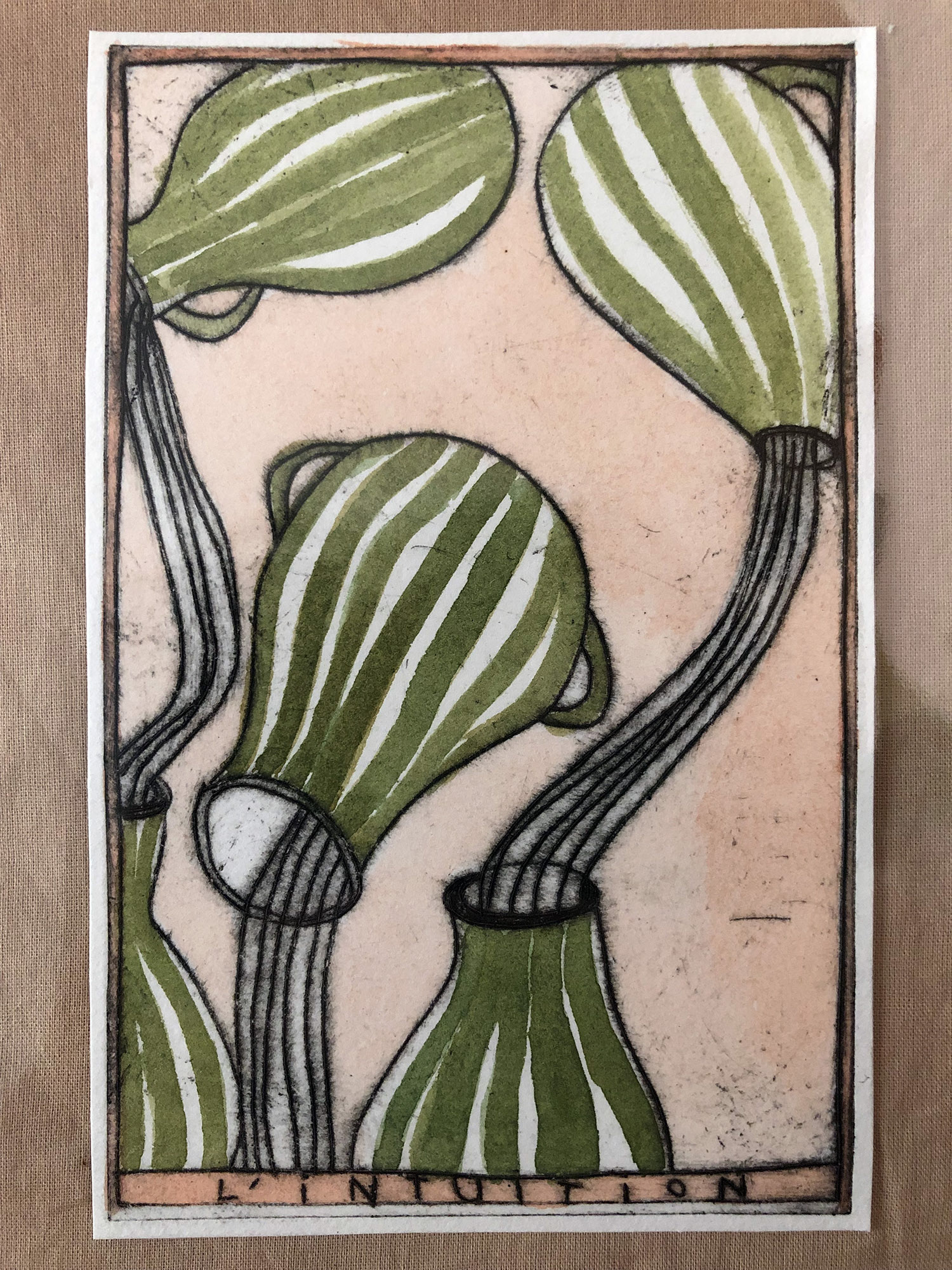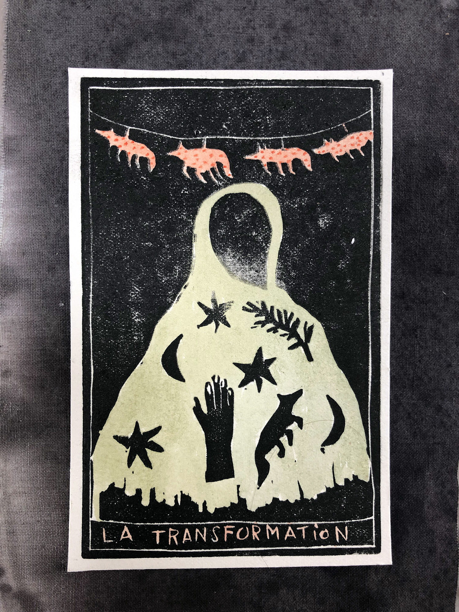 J'ai crée cet oracle intuitif en gravures sur rhénalon et en linogravure réhaussées à l’aquarelle. Les oracles m'accompagnent et me guident régulièrement. J'aime leurs valeurs symboliques, mystérieuses et j'aime par dessus tout l'idée qu'ils génèrent, c'est à dire que nous n'avons pas la maîtrise sur tout, et peut être même sur rien du tout! J'aime l'appeler "le grand jeu de la vie".